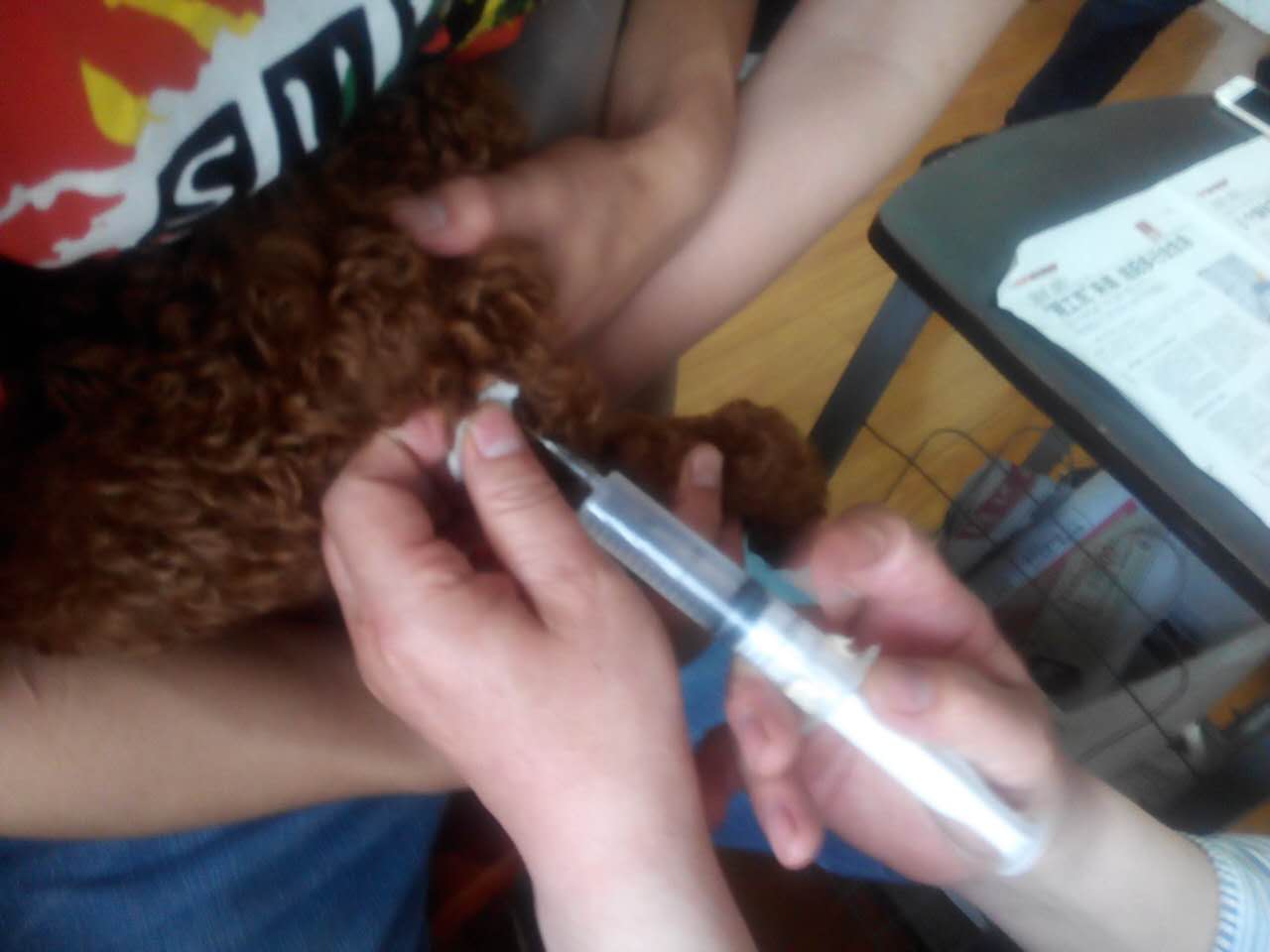 洛龍區元華國際,母泰迪犬童童從高處墜落己四天,X光片顯示右前肢前臂骨遠端完全骨折,且呈100度背角移位。