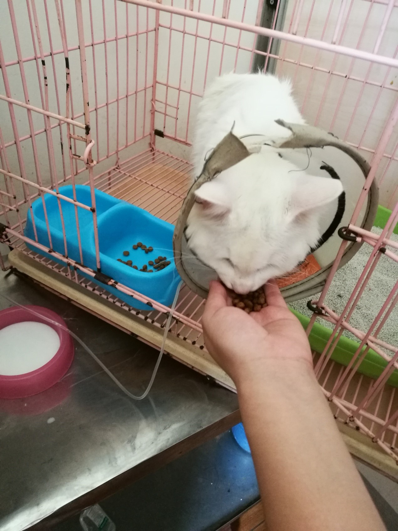 小白,小公貓,有2天未見排尿,精神差,來我院就診,經(jīng)問診,主人長期網(wǎng)購貓糧,經(jīng)儀器檢測,左腎腫大,腎衰,膀胱積尿,膀胱有結石,尿道口有結石,導尿困難。經(jīng)過治療現(xiàn)已完全康復,恢復了往日的活潑。